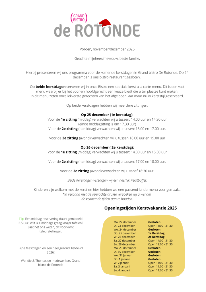 De reserveringen voor Kerst lopen hard! De 2e & 3e zitting op 1e Kerst zitten vol! Wel is er nog plek voor de 1e zitting! Onder het kopje ´Kerst 2025´ een overzicht over hoe wij geopend zijn in de Kerstvakantie. Informatie betreft het Kerstmenu & Catering volgen nog.