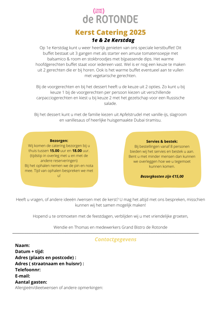 De reserveringen voor Kerst lopen hard! De 2e & 3e zitting op 1e Kerst zitten vol! Wel is er nog plek voor de 1e zitting! Onder het kopje ´Kerst 2025´ een overzicht over hoe wij geopend zijn in de Kerstvakantie. Informatie betreft het Kerstmenu & Catering volgen nog.
